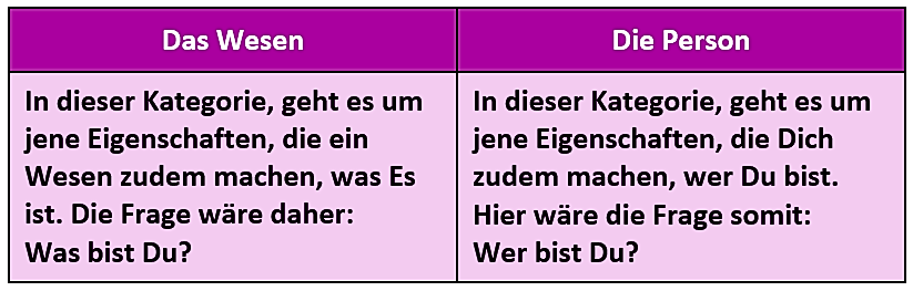 Wenn wir diese zwei Kategorien auf Dich und Mich anwenden, also ich nehme an, Du bist auch ein Mensch, und jemand fragt uns danach, WAS WIR SIND? Dann können wir beide antworten: „ICH BIN EIN MENSCH.“